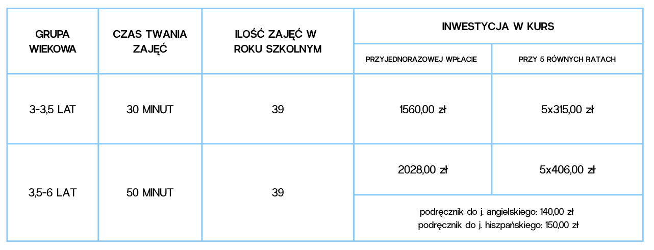Zajęcia prowadzone są w formie nauki przez zabawę, konwersację i cotygodniowe powtórki. Każdy kursant z naszych zajęć wychodzi z zadaniem domowym, które realizowane jest w formie zadań na platformie online lub w ćwiczeniach. Dzięki temu, że uczniowie zyskują motywację do powtórzenia materiału ich postępy widoczne są gołym okiem!