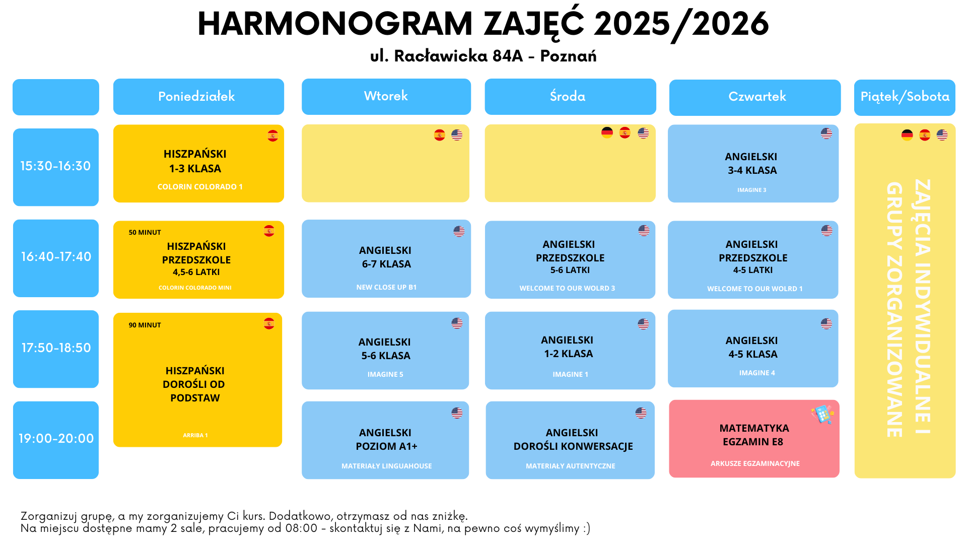 Nasza szkoła językowa w Poznaniu to idealne miejsce dla osób, które pragną opanować język obcy w atmosferze sprzyjającej nauce i efektywności. Oferujemy szeroką gamę kursów, dostosowanych do różnych grup wiekowych – od najmłodszych, przez młodzież, aż po dorosłych. Zajęcia prowadzone są w małych grupach, co zapewnia indywidualne podejście do każdego uczestnika, a także w formie korepetycji, dla tych, którzy wolą kameralną atmosferę. Dzięki naszym metodom nauka staje się przyjemnością, a szybkie postępy motywują do dalszej pracy nad językiem.