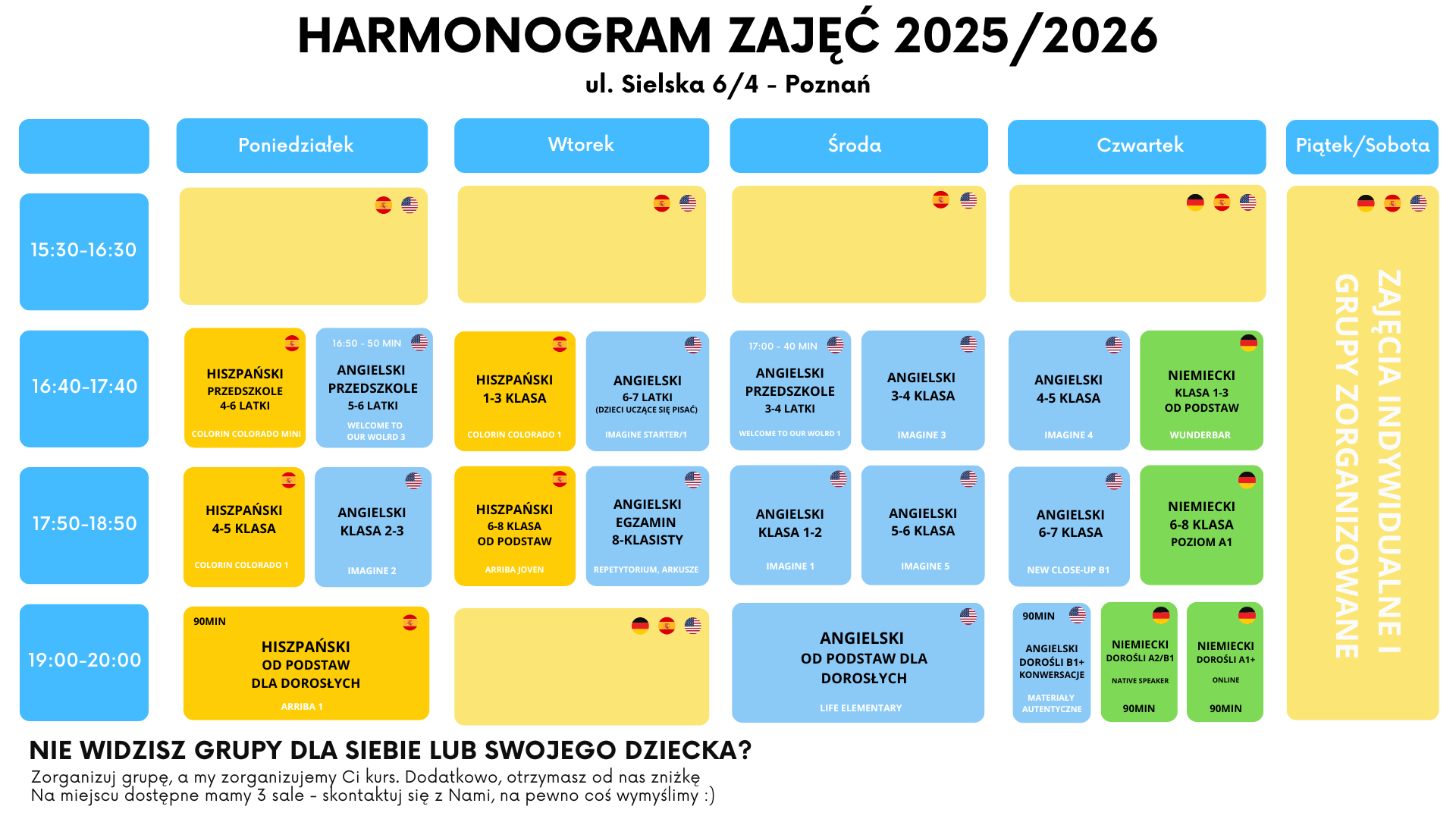 Szkoła językowa na Górczynie to doskonałe miejsce dla osób pragnących poszerzyć swoje umiejętności językowe. Oferujemy kursy językowe w różnych językach, które są dostosowane do potrzeb kursantów w każdym wieku – od dzieci, przez młodzież, po dorosłych. Nasza szkoła stawia na profesjonalne podejście, kameralne grupy oraz indywidualne dopasowanie kursów, co sprawia, że nauka jest przyjemna i skuteczna.